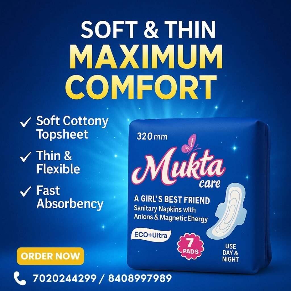 Founded with a vision to offer affordable, eco-conscious, and ultra-comfortable sanitary products, Mukta Sanitary Pads are crafted with care, using skin-friendly materials and advanced absorption technology. We combine innovation with compassion to meet the real needs of real women—from students to working professionals, from rural communities to urban households.
